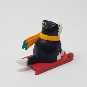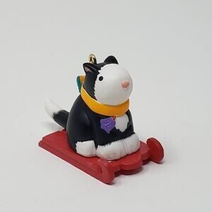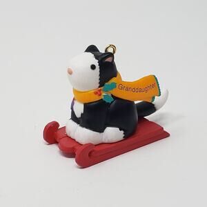 1996 Hallmark Granddaughter Ornament. This Christmas tree ornament features a kitty-cat riding on a sleigh in her bright yellow scarf.