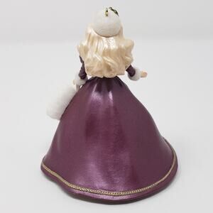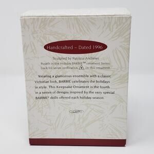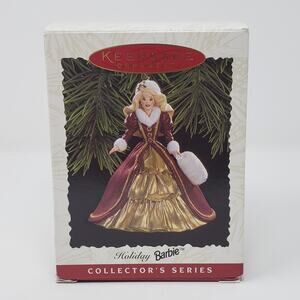 1996 Hallmark Holiday Barbie Ornament. This ornament is number 4 in the Holiday Barbie Collector's Series. This ornament features Barbie in her gold ball gown, with her maroon long coat.