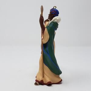 1996 Hallmark Kindly Shepherd Ornament. This ornament features a shepherd dressed in a yellow robe with red accents and a green/blue scarf. This has never been displayed and was unboxed for photos. Approx Dimensions 4.75" tall