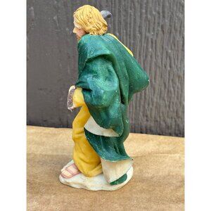 This hand-painted resin figurine features a bearded man in a green and yellow robe, walking with a wooden staff. The intricate details and craftsmanship make it a unique collectible or decor piece.
