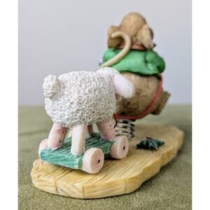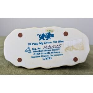 1996 Mouse Tales Priscilla Hillman Christmas Holiday Figurine "I'll Play My Drum For Him" #178721 by Enesco. Incredibly detailed and absolutely adorable, the slightest touch and the drum playing mouse moves on a spring. He has a toy lamb on a string behind him. The colors are soft pastels in beige, tan, white green, red and pink.