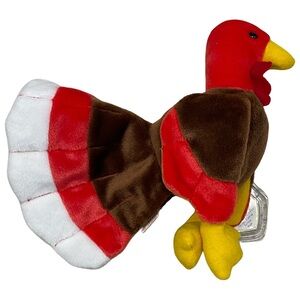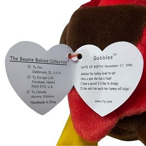 Adorable turkey plush toy with vibrant colors. Features red, brown, and yellow hues. Perfect for collectors or as a gift. Ty Beanie Baby named Gobbles the Turkey. Gobbles is a plush toy with a brown body, red head and wattle, yellow beak and feet, and a tail featuring white, red, and brown plush sections. The Beanie Baby has a Ty heart-shaped tag attached to it. Gobbles was introduced on November 27, 1996, and retired on December 31, 1998.