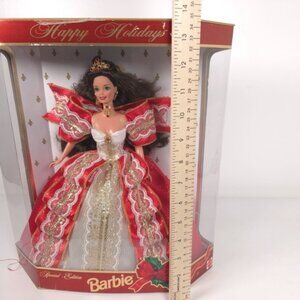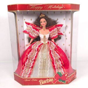 The 1997 Barbie Happy Holidays Barbie Doll Special Edition is a vintage Barbie doll from the Happy Holidays Barbie series by Mattel. This 11.5-inch doll features black, wavy hair, green eyes, and a light complexion. It is part of the original Happy Holidays Barbie collection manufactured in 1997 in China. This Hallmark Keepsake special edition Barbie is perfect for collectors and fans of Barbie fashion dolls, with a theme of fashion and beauty that appeals to teens, adults, and youth alike. The doll is sealed in the original packaging, making it a sought-after item for Barbie enthusiasts.