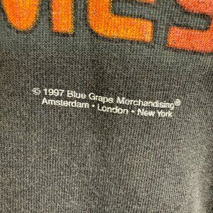 This 1997 Blue Grape T-shirt features a bold flaming graphic on the front and "Damned In Flames" text on the back. Crafted from 100% preshrunk cotton, it offers durability and comfort. A vintage collectible for enthusiasts of 90's graphic apparel.
