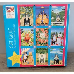 For sale is this Great American Puzzle Factory Vintage 1997 Cat Quilt By Elizabeth King Brownd Jigsaw Puzzle 1000+ pcs 20" x 27" Made In USA Item #8056 ISBN 1-56646-331-9. This vintage puzzle is brand new and sealed. Please note the box has dents and is caving in, but the contents inside remain untouched and intact. Perfect for puzzle enthusiasts who don't mind a little box wear. Comes from Smoke-Free Shop.