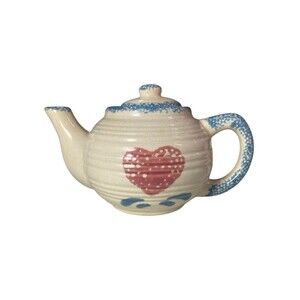 The 1997 Hermitage Pottery teapot is a charming piece of Americana with a heart pattern, standing at 3.5 inches tall and 6 inches wide. Crafted from ceramic using pottery techniques, this multicolored teapot adds a touch of nostalgia to any collection or kitchen decor. Perfect for serving tea or as a decorative piece, this vintage teapot from 1997 brings a unique and whimsical flair to your home.