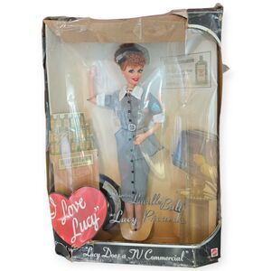 The 1997 I Love Lucy Barbie Doll is a vintage collectible featuring Lucille Ball's iconic character, Lucy. This Pink Label Barbie by Mattel stands at 11 1/2 inches tall and has curly red hair with a light complexion and blue eyes. The doll comes in its original packaging, making it a sought-after piece for collectors. Made of vinyl, hard plastic, plastic, and fabric, this Barbie is a fashion doll representing the character of Lucy from the I Love Lucy franchise.