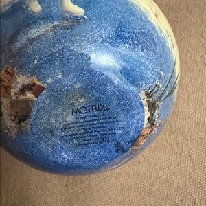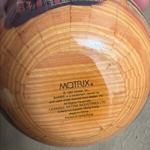 10” circumference, made by Matrix for Mattel inc. The bottom of the ball reads. “Matrix, 1997 Mattel Inc., Made in China 🇨🇳, printed in Hong Kong 🇭🇰