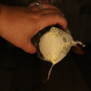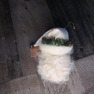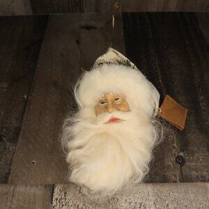 Unique ornament has Santa wearing a cream and gold hat with a wreath around it and "hair".