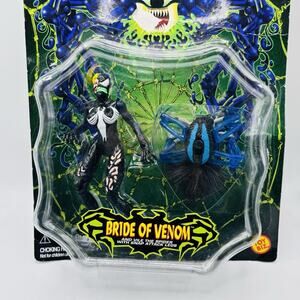 The product is a vintage 1997 ToyBiz Marvel Spider-Man action figure featuring the character Bride of Venom from the Spider-Man movie. This sealed on card figure stands at 5.5" tall and is a part of the Marvel Universe franchise. Produced by Marvel Toys, this action figure is a collectible item for fans of the Spider-Man comics and TV show, making it a valuable addition to any collection of action figures from the 1990s.