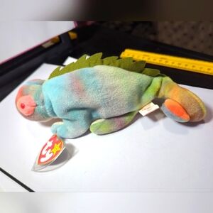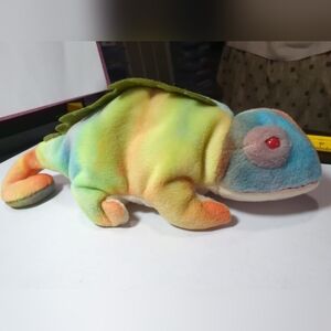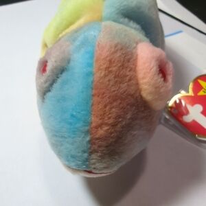 *Error in color- tye-dyed in bright greens, pinks, yellows, purples and oranges (rather than dark blue color- factory workers mixed up fabrics for this beanie baby with that of the "Rainbow" the Chameleon)