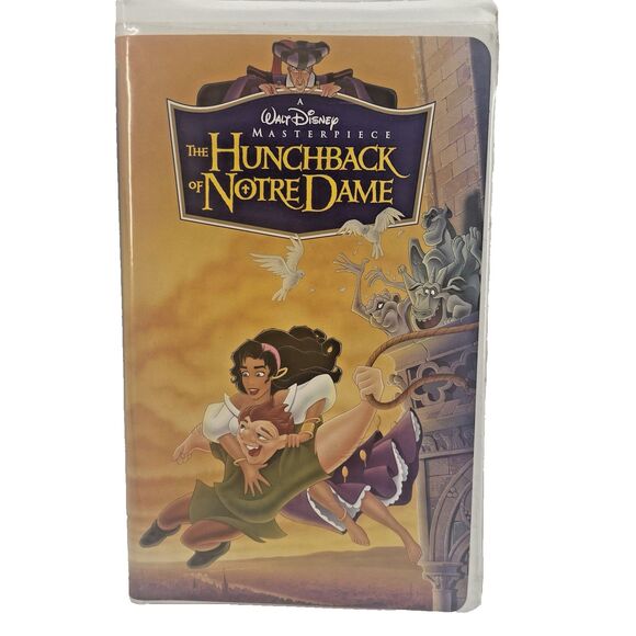This product is a sealed VHS tape of the 1996 Disney animated film "The Hunchback of Notre Dame". Directed by Gary Trousdale and Kirk Wise, this G-rated movie falls under the genre of drama and is presented in English language with NTSC signal standard. Produced by Disney as part of their Masterpiece edition, this VHS tape captures the classic animated tale of Quasimodo, the lovable hunchback, and his adventures in 15th-century France. Perfect for fans of family-friendly animated films, this original Disney VHS tape is a must-have collector's item.