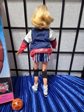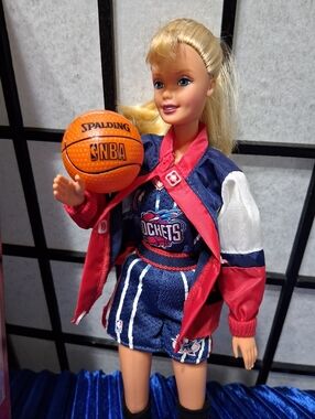 Barbie wears a Rockets jersey and coordinating jacket. Doll holds a miniature basketball. Outfit shows red, navy blue and white team styling. Ready for shelf display.