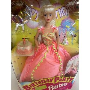 Celebrate your little girl's birthday with this 1998 Barbie doll. The doll comes with a set of blow-up balloons, a birthday cake, and a party dress. The doll's blonde hair and blue eyes add a touch of elegance to the doll's overall look. The doll is 11 1/2 inches in size and is made of plastic. The doll is an original, licensed reproduction from Mattel and is part of the Happy Birthday Barbie product line. The doll's packaging is original and unopened, making it a perfect collectible item. The doll was manufactured in Malaysia and is a Caucasian girl doll. Wish your little girl a happy birthday with this beautiful Barbie doll.