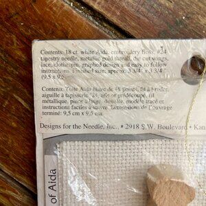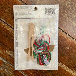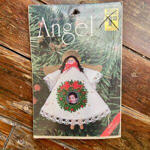 An angel clothespin Christmas tree ornament with room for a photo counted cross stitch kit by Designs For The Needle called Wreath Photo. #1446 Finished size would be 3 3/4" x 3 3/4". Made in the USA. ~Excellent New In Package Condition~ No issues. See photos for more information.