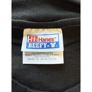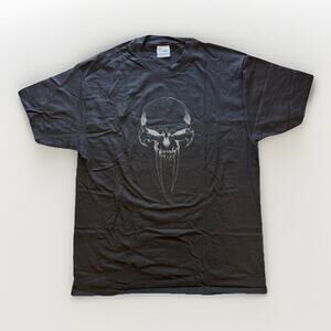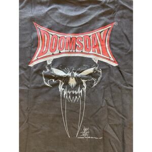 Ultra-rare 1998 Doomsday T-shirt designed by guitarist/vocalist Mike Flippin, created to promote the band’s 1995 heavy metal album under Chaos! Communications. Features the Doomsday fanged skull logo and signature red arch branding, both used across the band’s music merch and cover art. The CD this tee promoted was released to support the Lady Death and Evil Ernie comic franchises, and even featured Evil Ernie on the cover.