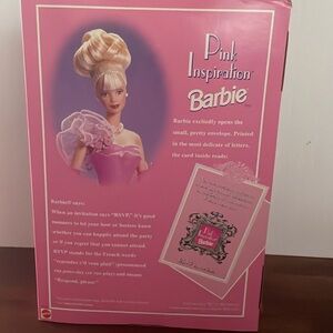 1998 Pink Inspiration Barbie Special Edition. Enhance your doll collection with this stunning Mattel 1998 Toys R Us Pink Inspiration Blonde Barbie. It features a unique design with a colorful costume. This Pink Inspiration Barbie has a full-length gown with rose details on the bodice and waist. It includes a pair of matching gloves, a necklace and earrings. The doll also has a windowed box for displaying as part of a collection.