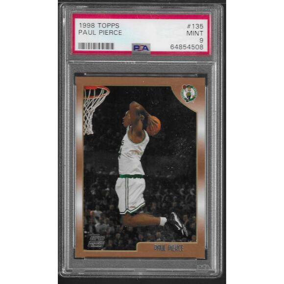 This is a 1998 Topps #135 Paul Pierce Rookie Card featuring the player as a rookie for the Boston Celtics in the National Basketball Association (NBA). The card is manufactured by Topps and is part of the 1998 set. It is a sports trading card and has been graded as a PSA 9 Mint.