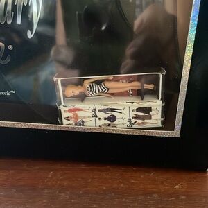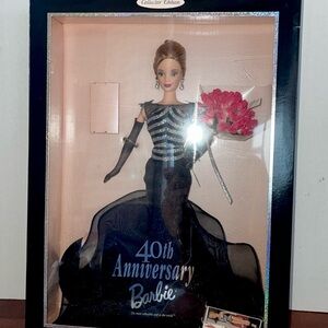 1999 40th Anniversary Barbie NIB Collector Edition Mattel 21384 NRFB with Certificate of Authenticity. Who but Barbie could look even better on her 40th anniversary than on her first debut? 1959 meets 1999 as Barbie doll dons a black gown nostalgically reminiscent of her original 1959 striped-pattern bathing suit. She wears a sparkling black-and-white striped gown with sheer gathers at the shoulders and an explosion of fabric designed as a fishtail hem that absolutely defies gravity. But what makes Barbie popular to collectors is her ability to accessorize down to the tiniest detail. In this instance she wears "diamond" drop earrings, sheer black pantyhose, black pumps, and has dramatically upswept hair. Our anniversary girl holds a bouquet of 40 roses with a card that says "Happy 40th Anniversary“ which she gracefully holds in her arms that are covered with sheer opera length gloves. This Barbie steps into the present--with a wink at the past--with the inclusion of the "doll's doll." 40th Anniversary Barbie comes with her own scaled-down premier doll, dressed in said bathing suit and packaged in a box that mimics the original. (Has fallen to bottom of box) It comes with display stand.