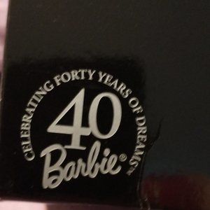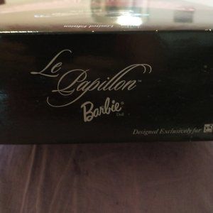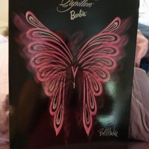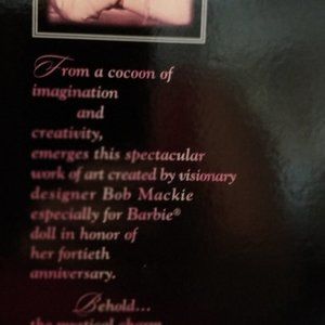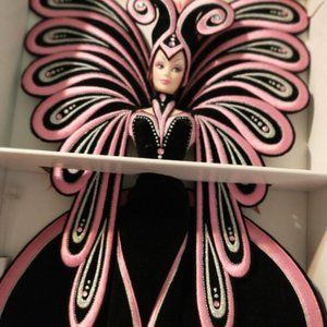 Celebrating Barbie's 40th anniversary, Bob Mackie's fantasy of the shimmering wonder of a butterfly. Draped in dramatic, strapless, velvety black with circular train & black stockings. Adorned with pink and silvery embroidery, and two shimmering rose-colored rhinestones. Large black butterfly wings with silvery & rose-tinted embroidery, speckled with rhinestones and a fabulous headpiece befitting the beauty of a butterfly with lavender eyes & pink hair. Original sketch & bill of sale included