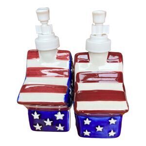 1999 Boston Warehouse American Flag Star Shape Mustard and Ketchup Pump Set. This set has never been used in like new condition but there is no original box. Please see photos as they are part of the item description-photos are always of the exact item you will receive. All items are from a smoke free home.