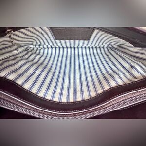 A vintage 1999 Coach Greenwich tote/shoulder bag in khaki twill with dark brown leather trim and handles. It features 3 main compartments—2 open and 1 with a zip closure, an interior side wall zip pocket, white and blue striped canvas interior throughout, a leather Coach hang tag, and leather Coach frontside tag. The interior leather Coach Creed states that this bag was made in the USA—making it very rare—and is numbered D9C-6134.