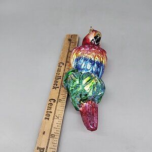 The product is a vintage 1999 Christopher Radko Blue Amazon Large Parrot Glass Christmas Ornament, measuring 8 inches in length. This ornament features a beautiful blue parrot design, made of glass, and is part of the Ornaments collection. With its intricate details and large size, this ornament would make a standout addition to any holiday decor or Christmas tree.
