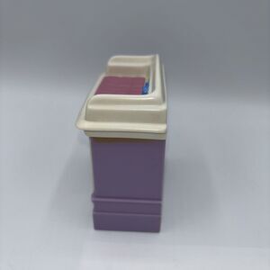 The 1999 Fisher-Price Loving Family Dollhouse 4" Baby Changing Table Nursery in purple is a vintage dollhouse furniture piece designed for young children aged 3-8 years. This toy is part of the Loving Family character family, specifically targeted towards girls. Made in China by Fisher-Price, this dollhouse accessory is perfect for imaginative play and adding detail to a dollhouse setting.