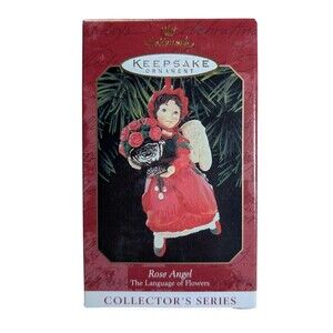 1999 Hallmark Rose Angel ornament, Hallmark Language of Flowers series, Sue Tague Hallmark angel, vintage Hallmark collectible, floral angel ornament, Victorian rose keepsake, remembrance ornament, love and remembrance gift, rose bouquet angel, red dress angel figurine, NIB Hallmark angel ornament, 90s Hallmark collector ornament.