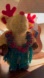 1999 Xmas Moose with Lei & Hula Skirt by Fiesta. Features red antlers and a green & red felt lei and green hula skirt made of yarn with velcro attachment. Moose also stands in black boots for dancing.