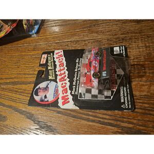 Vintage new old stock 1999 Maisto 1:64 scale die-cast NASCAR stock car featuring Bobby Hillen Jr., Chevrolet #8 Mac Attack “Home Run Record-Breaking” design inspired by Mark McGwire. Red and white color scheme with “Clean Shower Mac Attack” on the hood. Includes display base labeled #8 Mac Attack. Die-cast metal collectible with minor package damage, including rip, creases, and handling wear on edges. Not for children under 3 due to small parts. Milestone Motorsports Marketing.