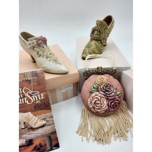 The set includes a purse and shoe, both made of resin material, and features decorative accents that add to its charm. This original and authentic set was manufactured in China in 1999 and is a part of the Nostalgia collection. Whether you're a fan of art deco or just love collecting unique items, this miniature purse and shoe set is a great addition to your collection.