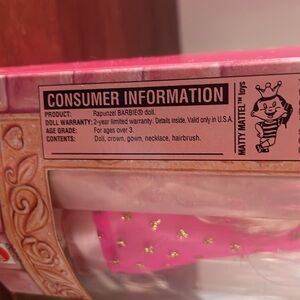 1999 Rapunzel Barbie NIB Mint Showcase your favorite childhood fairytale with the Mattel Rapunzel Barbie featuring long floor-length blonde hair, blue eyes and pink lips. This Mattel Barbie doll is wearing a beautiful floor-length deep pink gown with golden details and gold ribbon bow at the waist. A pink crown sits upon her blonde hair, with matching pink earrings and necklace to complete the look. She can’t wait for her prince.
