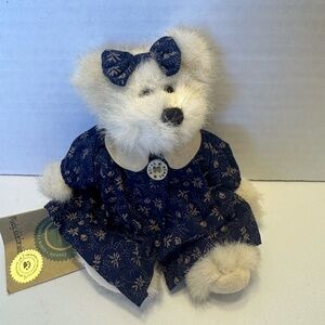 This bear’s name is Mindy Whitebriun and she stands at 6 inches tall. She is a white bear dressed in a beautiful navy blue dress with brown floral and paw patterns. She comes with her own knitted removable sweater. She is fully jointed and posable. She is a must have for any collector. Boyds Bears are no longer being produced.