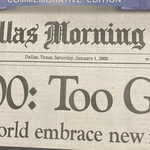 Here are three newspapers of special interest to those who love history. All newspapers are in excellent condition-with a little yellowing from aging- and are unread and complete. There is one Dallas Morning News from December 31, 1999. There is one Dallas Morning News from January 1, 2000. Finally, I have a Wall Street Journal from December 31, 1999. These have been carefully stored away since the Millenium and are ready to thrill anyone who remembers those times.