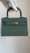 Modern and classic design mini handbag. Crafted in Genuine Epsom Leather in our Basil color with monochromatic stitching. The interior is lined also with basil colored leather and has one open slip pocket on the back wall.