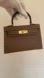 Modern and classic design mini handbag. Crafted in Genuine Epsom Leather in Elephant with contrast stitching. The interior is lined also with elephant colored leather and has one open slip pocket on the back wall.