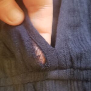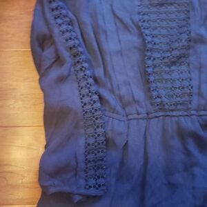 Has long flowing sleeves and an open back. On the backside, there is a small area that needs to be reattached on the trim. Should be a fairly easy fix.