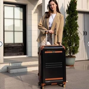Made from a polycarbonate-ABS blend with reinforced corner guards, accented with faux leather stripes.