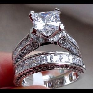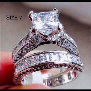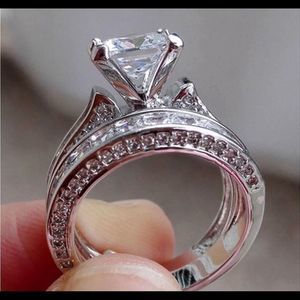 ✴14k White Gold Filled 1.25 Carat Princess Cut Diamond Cubic Zirconia Cz surrounded by 50 smaller round Diamond Cubic Zirconia down the sides. The matching band features 48 matching Princess Cut Stones in a channel Setting Wedding Engagement Bridal Band Ring Set.