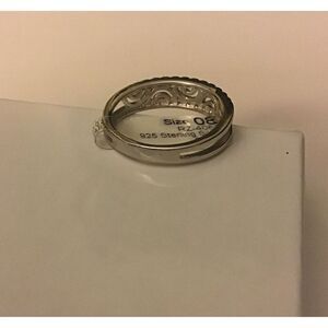 This beautiful band ring has a full carat of small round cut pave set simulated diamond gemstones on the top and bottom which showcase the body of the band, which has filigree swirl cutouts. The split band sides lead to a solid back. There are two full grams of .925 solid sterling silver in this ring and it is stamped for authenticity. It is size 8.