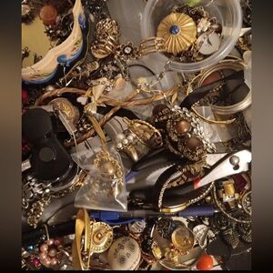 Vintage, Modern, Fashion, Rhinestones & so much more~ a good mix of pieces will be chosen especially for YOU from our huge displays & bins of jewelry. Note~ although I truly enjoy customizing, each lot is RANDOM & there is NO GUARANTEE OF CUSTOMIZATION OR SIGNED PIECES. NO RETURNS~ Sold AS IS. There is no guarantee of certain style, certain pieces, or pictured lots (but thank you for the compliment of liking our jewelry style & displays.😊)