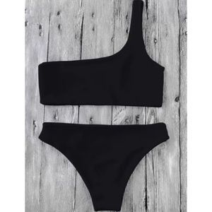 Contemporary asymmetric bathing suit featuring single shoulder pullover bikini top & low waisted hipster cheeky swim bottoms, non-padded. Nylon, Polyester, & Spandex for a comfortable sleek fit! Size Small! Color: Black! ♠️