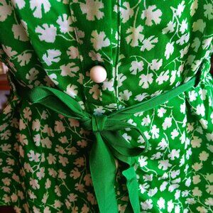 This charming 1970s vintage dress showcases a vibrant green and white floral print. It features a matching belt for a cinched waist, pleated skirt, and a side zipper for ease of wear. Ideal for those who appreciate timeless, classic styles from decades past.