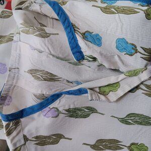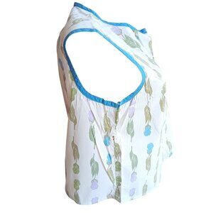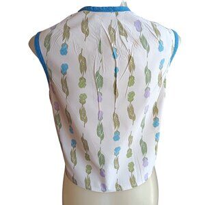 This vintage sleeveless blouse features a delicate floral print with green leaves and pastel flowers, complemented by blue trim. A timeless piece with charm.