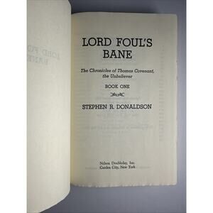 This product is a first edition/Book Club Edition hardcover book titled "Lord Foul's Bane" by Stephen R. Donaldson. Printed in 1977, this fantasy novel is written in English and comes with a dust jacket. As a collector's item, this original edition holds value for fans of the author and the genre. The special attributes of being a first edition and Book Club Edition add to its appeal for those looking to add rare and unique pieces to their collection.