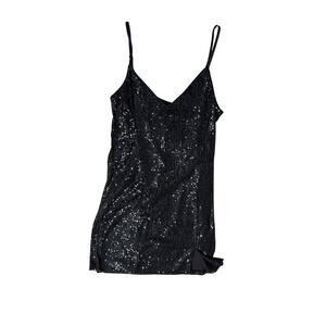 Stunning black sequin mini dress by 1.STATE, featuring a fitted silhouette and adjustable spaghetti straps. The perfect little black dress for parties, cocktails, or holiday events. Fully lined for comfort with shimmering sequins that catch the light beautifully.
