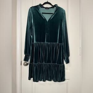 1.STATE Deep Green Velour Velvet Long Sleeve Ruffle Babydoll Dress w/ V-neck XL