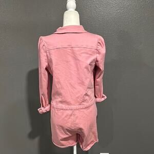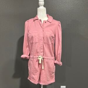 1. State pink short romper. Long sleeve romper features button-up front and drawstring waist. Top has a buttondown look with a collar, and the shorts are cuffed. Pockets. Fabric is a cotton blend, and the color is called "Blush" on the tag.