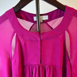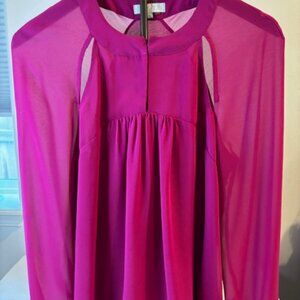 Round neck hook and eye closure long sleeve button loop closure lined flowy 100% polyester Fushia color. Two cold shoulder type openings on sheer upper front portion. 28" length. Excellent condition. No wrinkling.